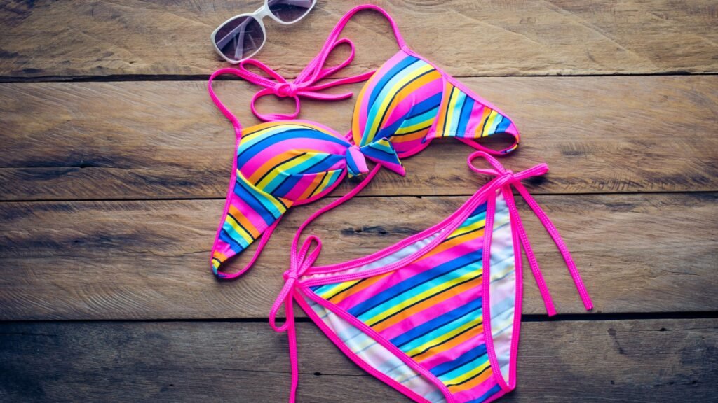 Pick sandals that match or contrast with your swimwear – for example, to match something with our Sweet Colorful Bikini, pick gentle light pink sandals, or maybe heels in green and pink colors. And if you want to be even crazier, go with yellow sandals! Yellow works fantastically as an accent color, whether it is footwear, a bag, or sunglasses.