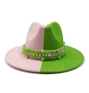 Why choose between two colors when you can have both? The Colorful Fedora Hat is a stylish split of pink and green, making it the perfect mix of playful and elegant. Its structured design offers a refined look, while the vibrant color combination adds a splash of personality to any outfit.