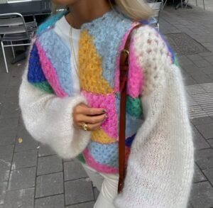 This cardigan features a delightful combination of colors and patterns, giving it a lively patchwork design that’s impossible to miss. Each section showcases a distinct knit texture, creating a visually stunning effect. It’s like wearing a masterpiece of modern knitwear, blending vintage inspiration with contemporary flair.